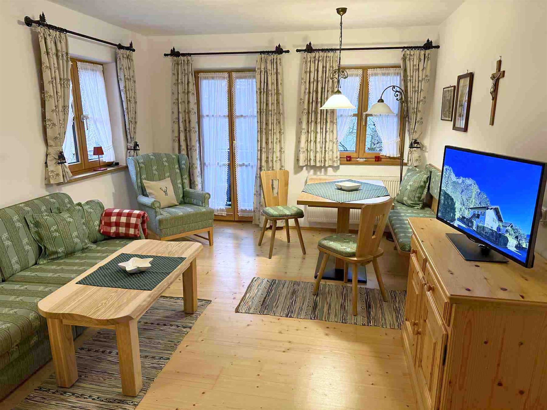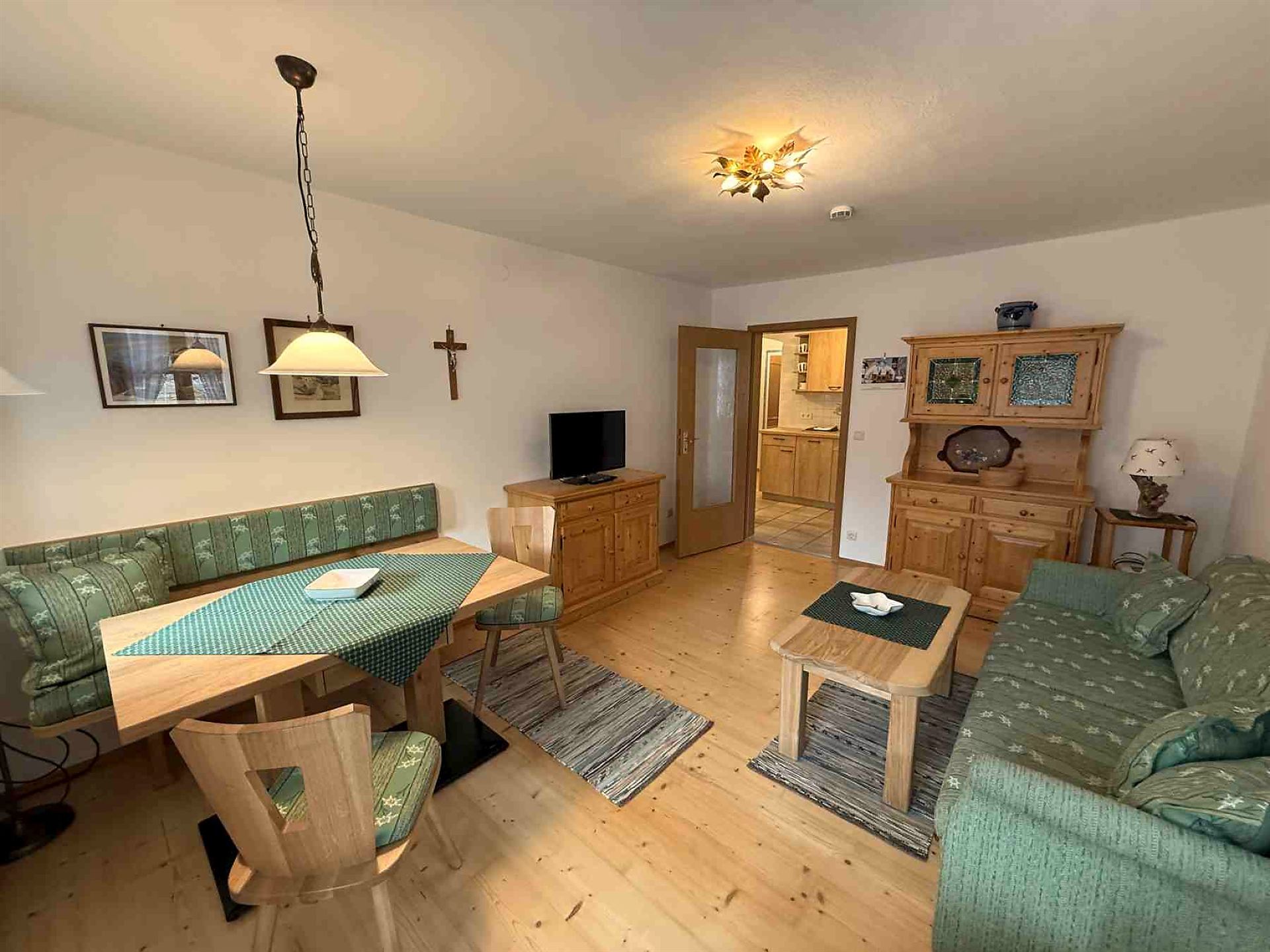 Die Ferienwohnung mit ca. 51 qm hat ein gemütliches Wohnzimmer mit Essbereich und SAT-TV.