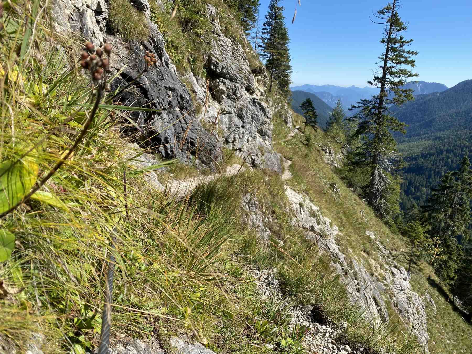 Direkt gegenüber der Alm führt ein kleiner Pfad in den Wald - hier beginnt der Lakaiensteig (nur für trittsichere und schwindelfreie Wanderer geeignet). Der Lakaiensteig wurde auf Geheiß von König Ludwig II. geschaffen, damit dieser sein Jagdhaus beim Soiernsee erreichen konnte. Der Steig für fast ohne Höhenmeter zum Soiernhaus. Es gibt ein paar schmale Stellen, bei denen wir sich an Drahtseilen zur Unterstützung festhalten können. Der Steig bietet wunderschöne Aussichten!