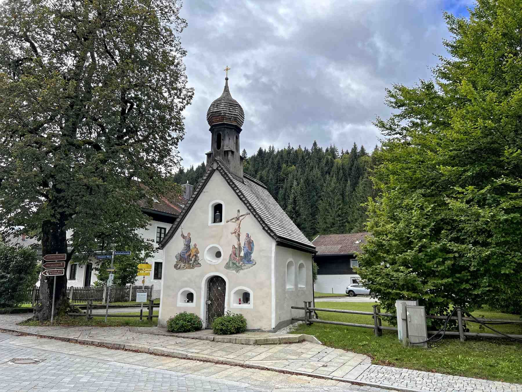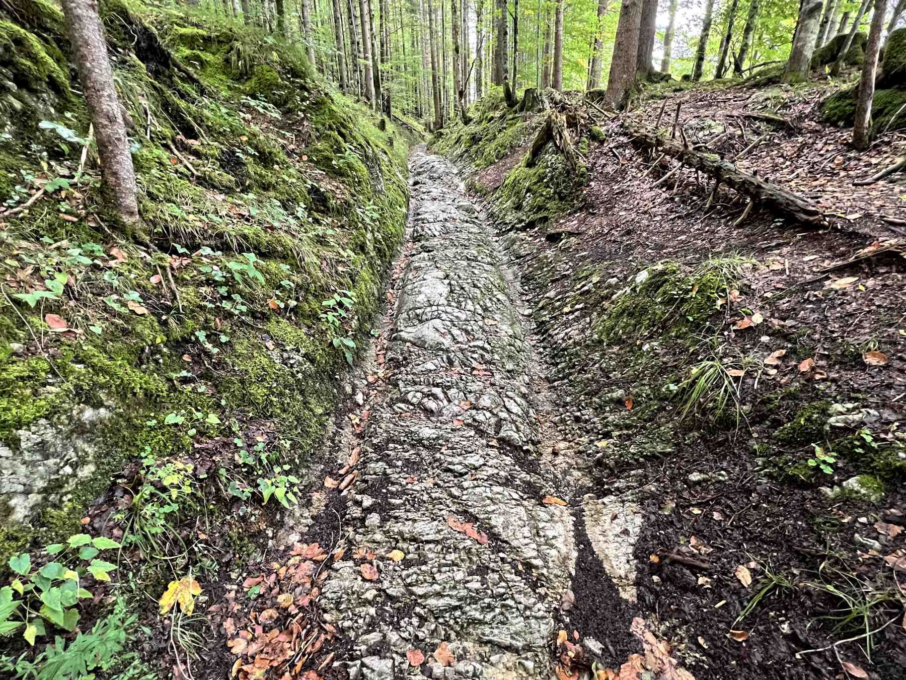 Wir gehen in Richtung der kleinen Kapelle und biegen in den Elmauer Weg ab. Kurz von dem Ortsende gehen wir links über den Steg des Kranzbaches. Jetzt schreiten wir über ein Teilstück des historischen Römerwegs, der im Zeitraum 195 bis 215 n. Chr. errichtet worden ist und eine wichtige Handelsstraße zwischen Trient und Augsburg war. Deutlich lässt sich die römische Spurbreite von 107 cm erkennen. Wer mit dem Kinderwagen unterwegs ist folgt lieber noch ein Stück dem Elmauer Weg bis kurz nach dem Ortsende und biegt dann nach links in den ausgeschilderten Wirtschaftsweg ab.