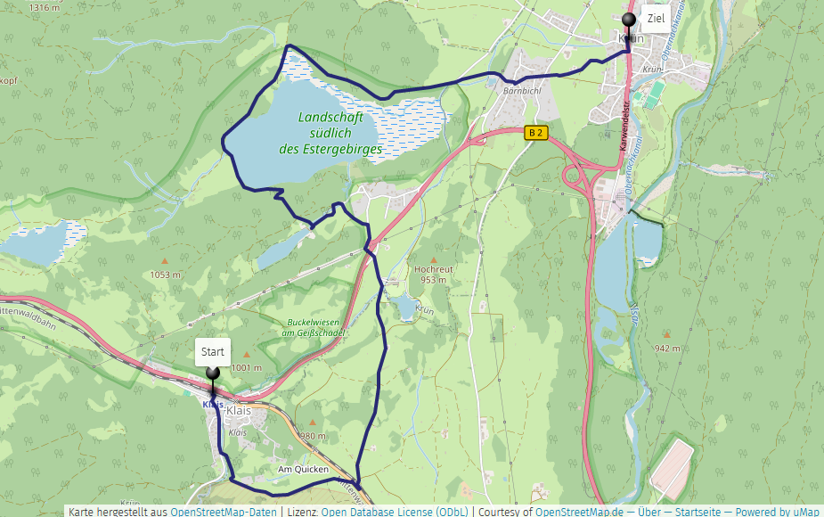 Diese Runde beginnen wir am Bahnhof in Klais. Direkt am Bahnhof befindet auch das Klaiser Stüberl, wo wir vor dem Start noch einen Kaffee und ein Stück Kuchen zu uns nehmen können.