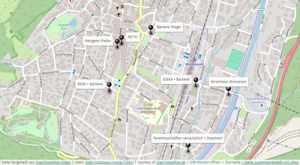 Unsere beiden Ferienhaushälften liegen nur 700 m vom Bahnhof entfernt, der Fußweg beträgt rund 10 Gehminuten. Vom Bahnhof fahren Regionalbahnen* in Richtung Garmisch-Partenkirchen und weiter nach München. Von Mittenwald aus können Sie auch nach Tirol fahren – sehenswerte Städte sind Seefeld in Tirol und Innsbruck.