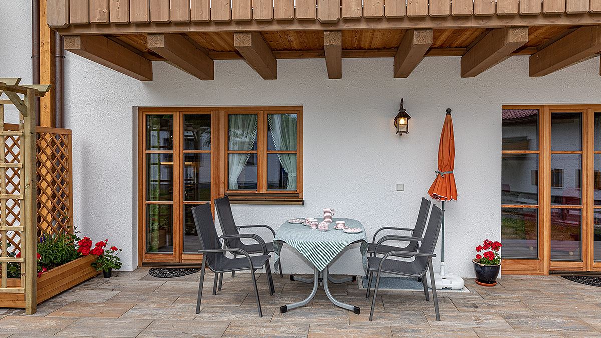 Die möblierte Südterrasse mit Liegewiese bietet einen Bergblick zu Karwendel und Wetterstein.