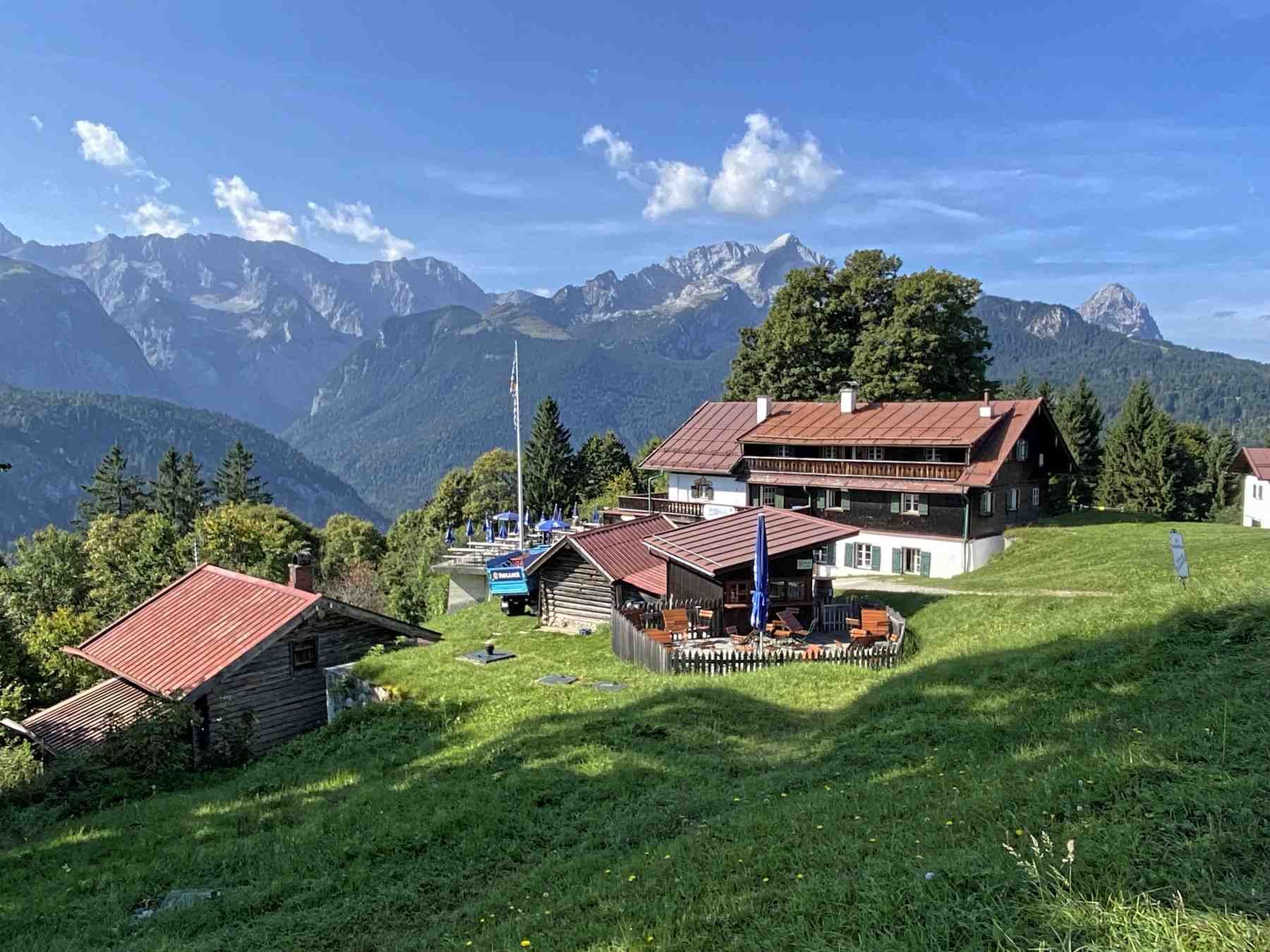 Nach der Ankunft an der Bergstation lohnt sich zunächst das kurze Stück zum Berggasthof Eckbauer zu gehen, um das hervorragende Panorama auf das Wettersteingebirge zu genießen.