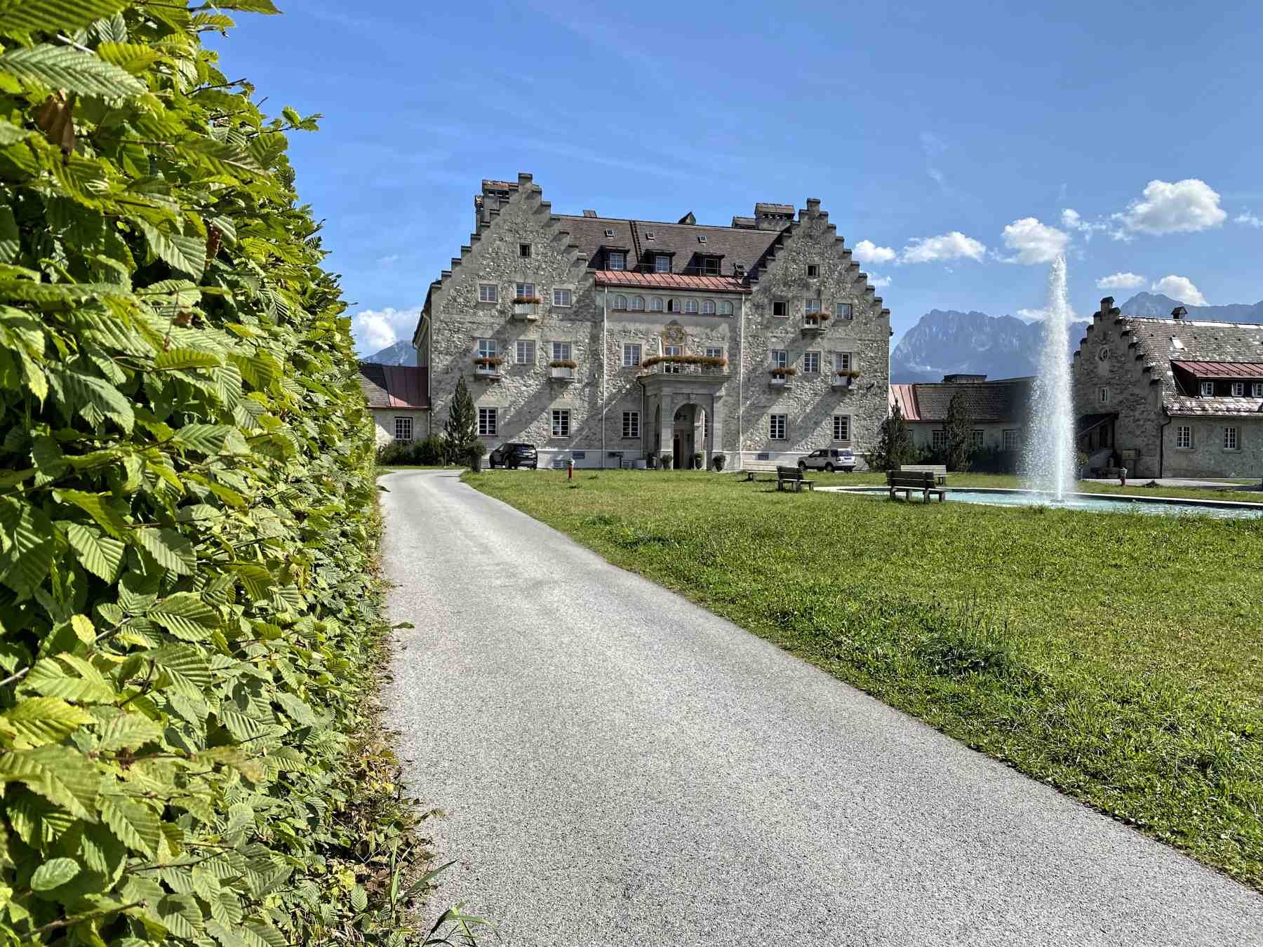 Von hier laufen wir talwärts und folgen den Wegweisern in Richtung Kranzbach folgen. Am Schloss Kranzbach (jetzt Hotelbetrieb) angekommen führt der Weg links am Schloss vorbei und anschließend über eine Lichtung bis zum Wald.