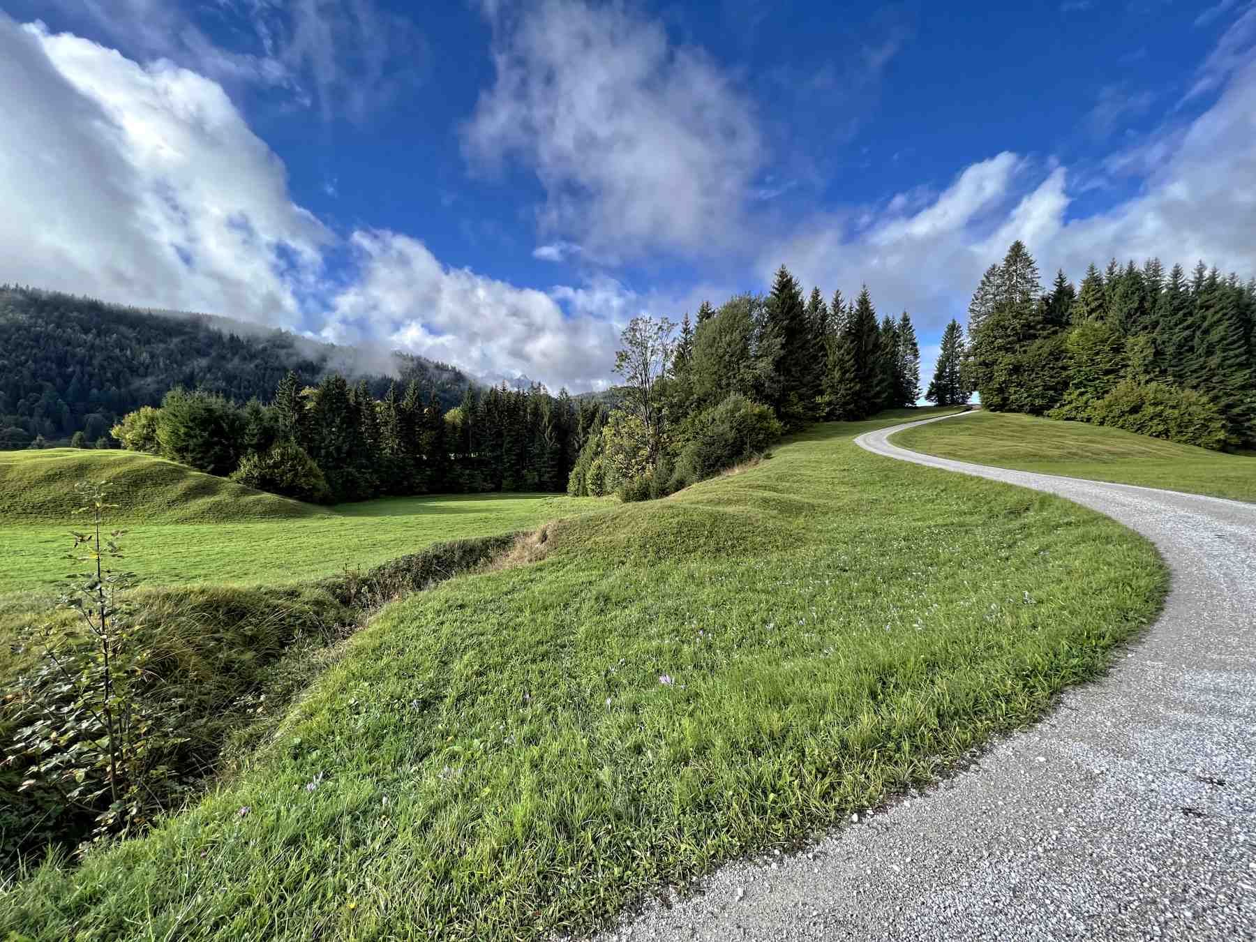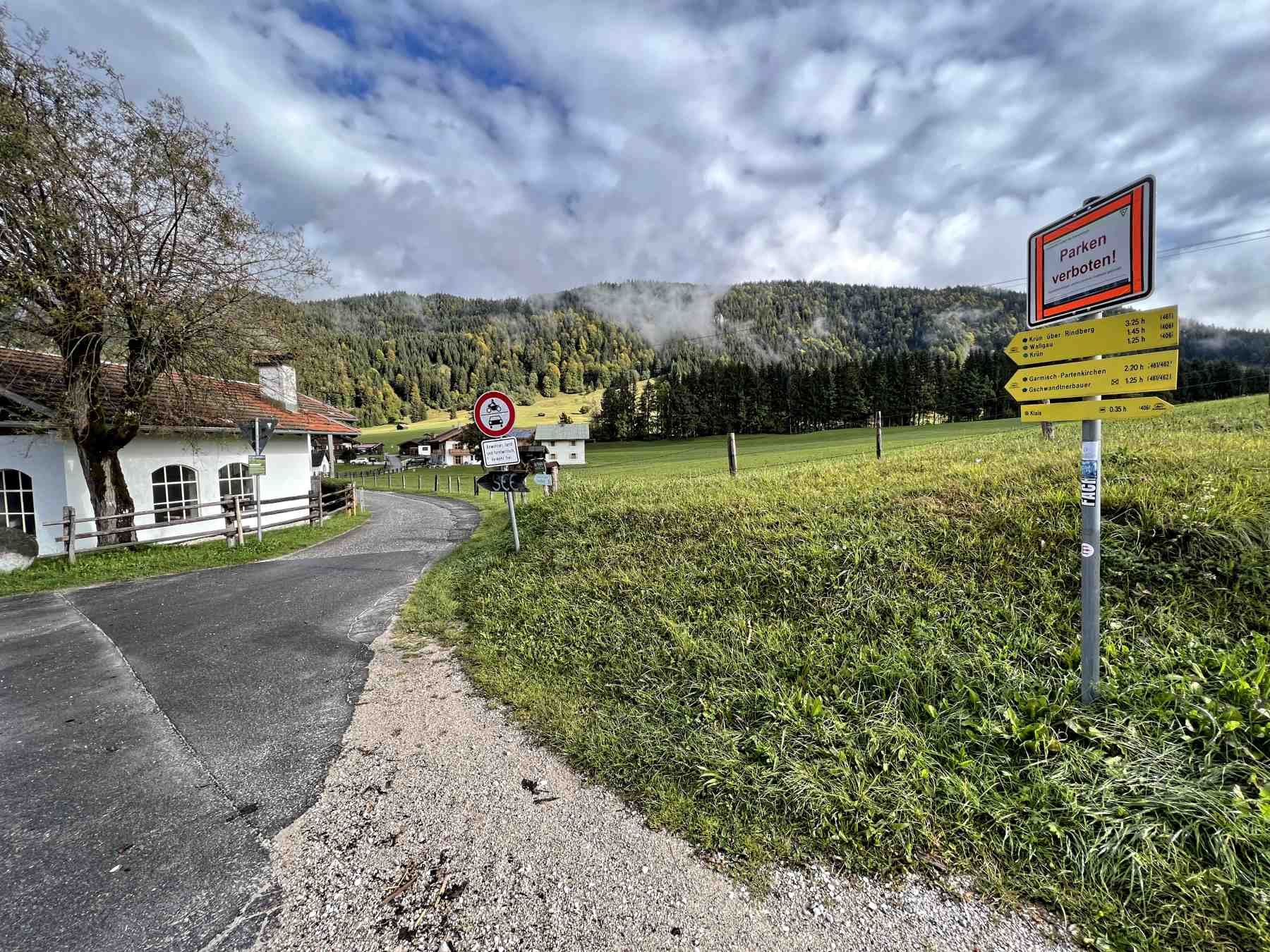 Von der Bushaltestelle aus durchlaufen wir die kleine Siedlung Gerold in Richtung der Ausschilderung "Krün über Rindberg - Weg 461". Rechter Hand liegt der Geroldsee, der jedoch von der Straße aus nicht sichtbar ist. Die Straße geht nun von Asphalt auf Schotter über. Nachdem wir die Wiesen durchquert haben verläuft die Wirtschaftsstraße weiter schattig durch den Bergwald.