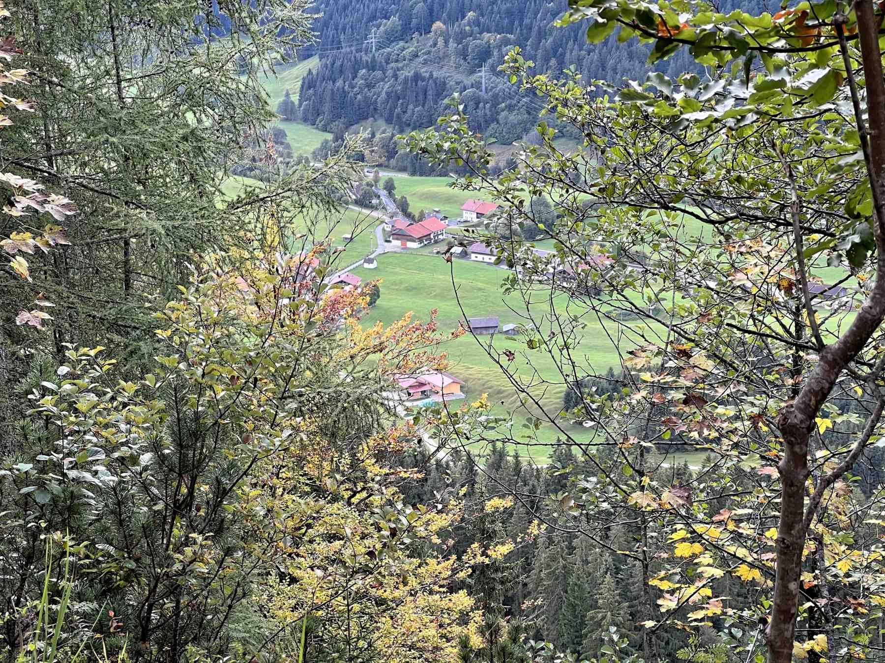 Etwa eine Stunde benötigen wir bis wir den höchsten Punkt der heutigen Tour erreicht haben. Von diesem Aussichtspunkt haben wir einen Blick auf Gerold. Von nun an gehen wir stetig bergab in Richtung Finzbachtal.