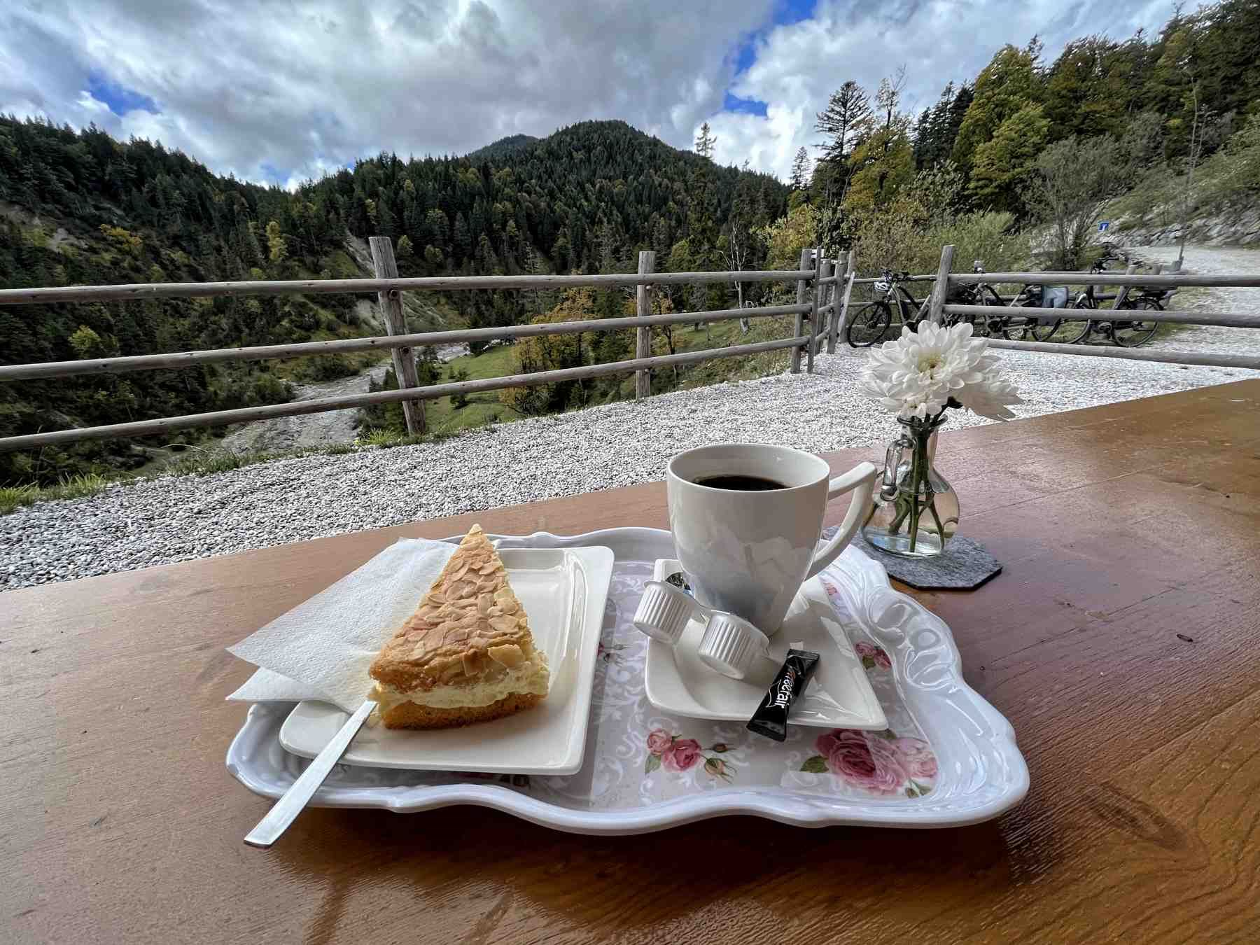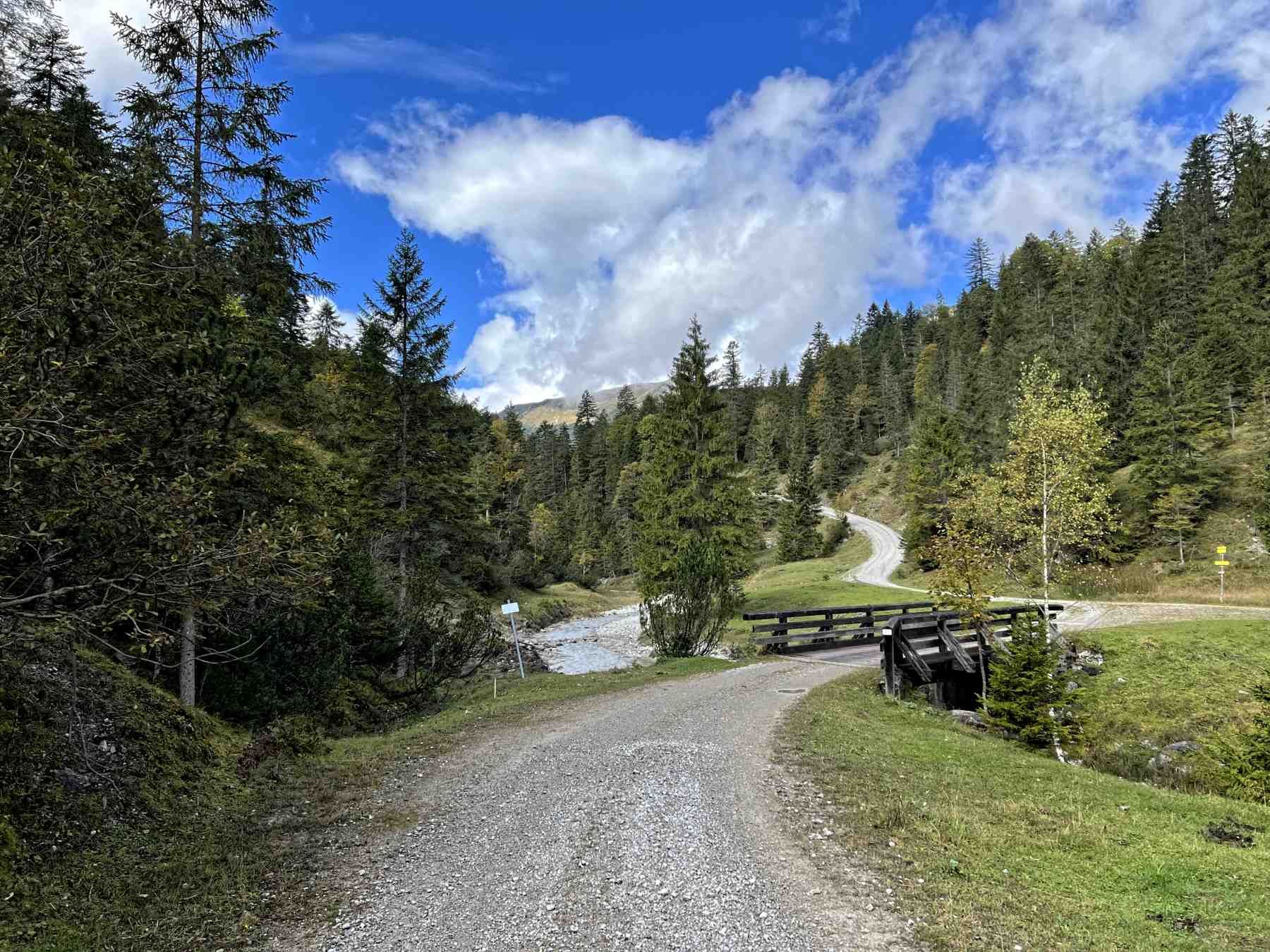 Nach etwa 30 Minuten haben wir den Abzweig Bauerngarben erreicht. Wir biegen nun nach links auf den Weg 452 ab, der uns direkt zur Brücke über den Finzbach Führt. Nach dem wir die Brücke überquert haben, biegen wir rechts in Richtung der Finzalm ab. Die Alm haben wir nach 25 min erreicht und können hier bei leckeren selbstgebackenen Kuchen oder einer Brotzeit die Aussicht in das Finzbachtal genießen.