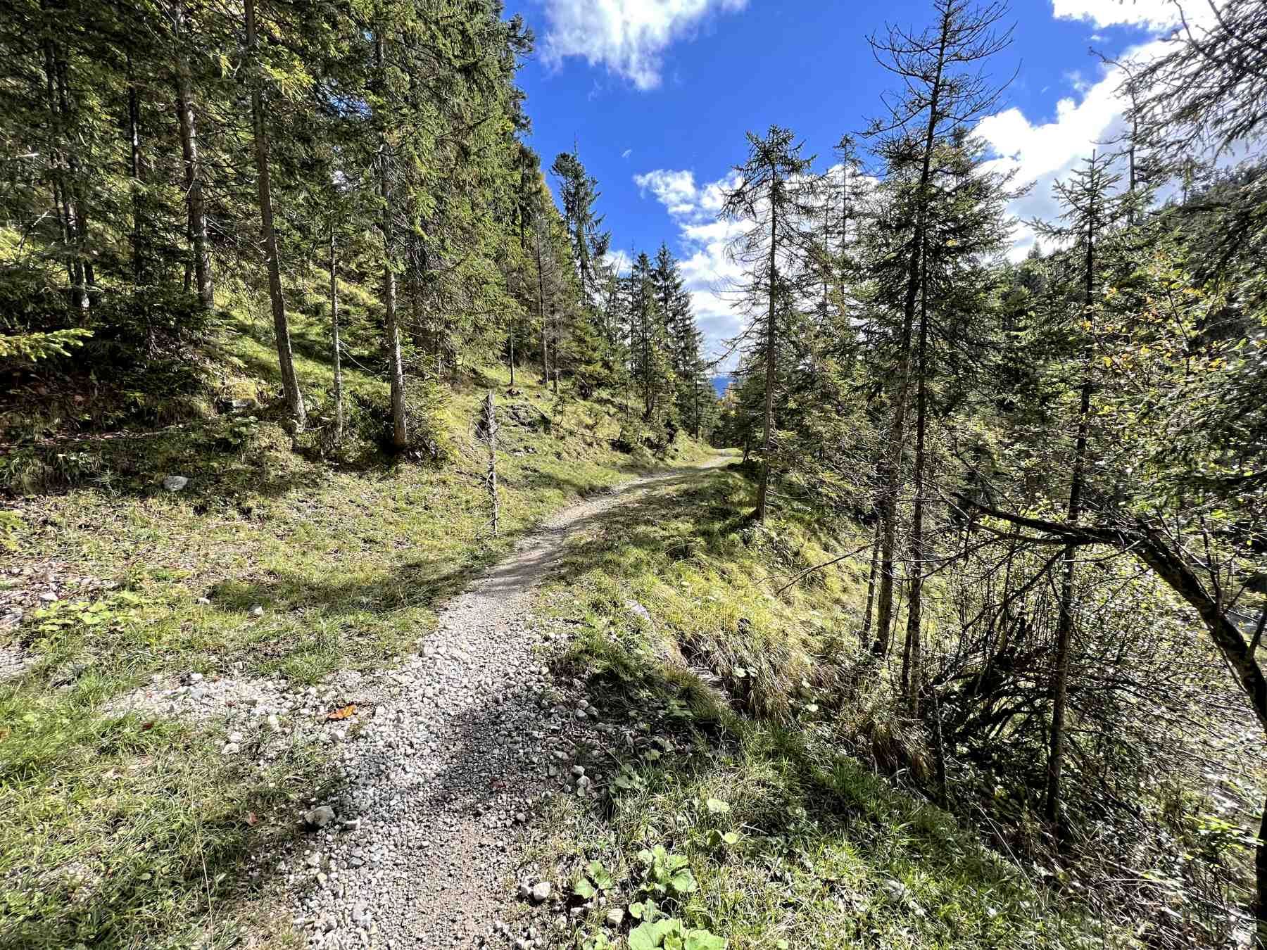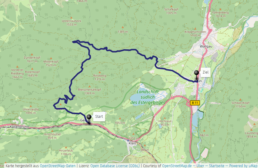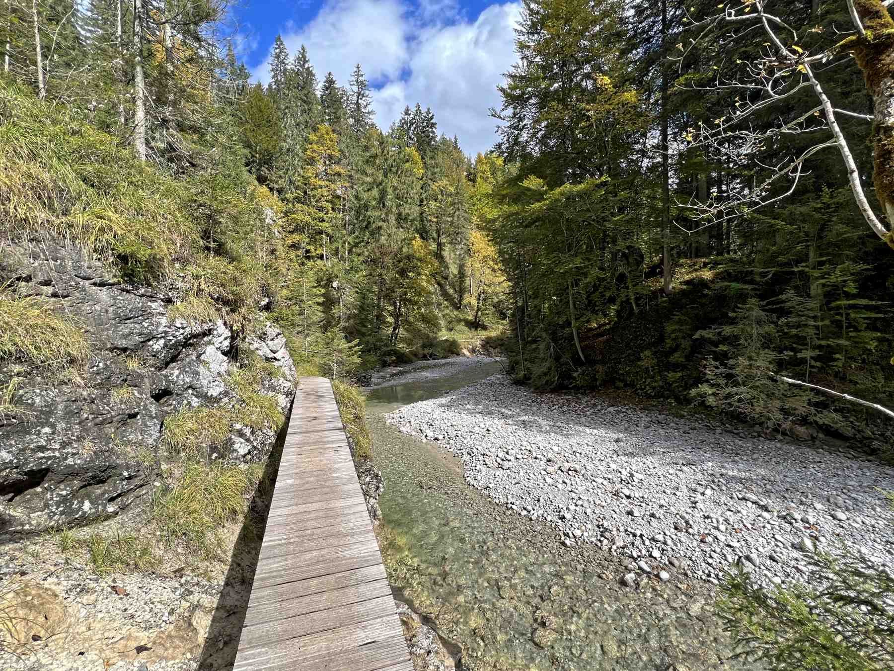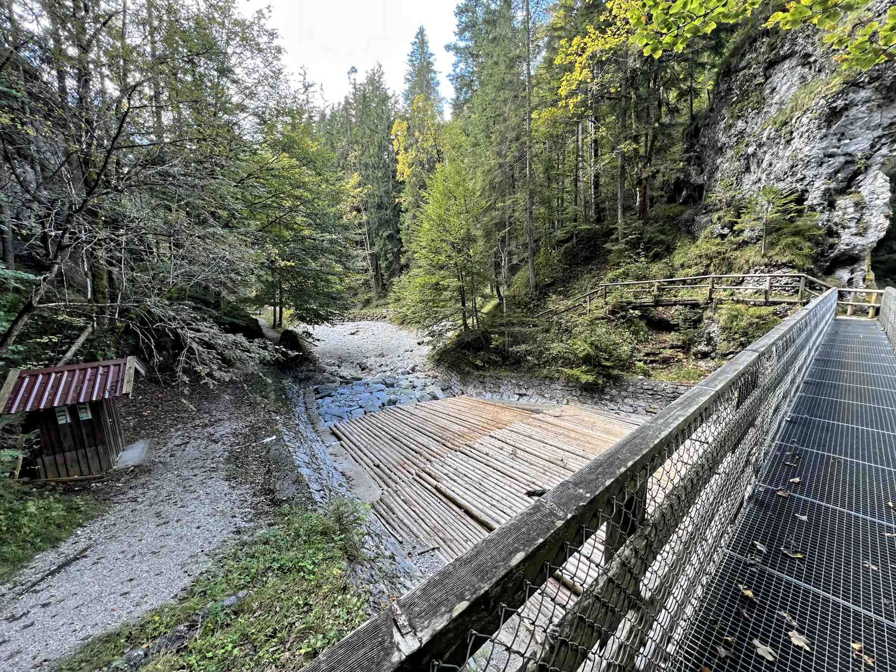 Der Weg durch die Finzbachklamm kann bei Nässe, insbesondere nach Regen, teils matschig sein und durch das viele Wurzelwerk rutschig sein. Alternativ können wir auf dem Forstweg verbleiben und auf dem Weg 450 nach Krün wandern oder auf den Weg 415 nach Wallgau (Bushaltestelle Rathaus) abzweigen.
