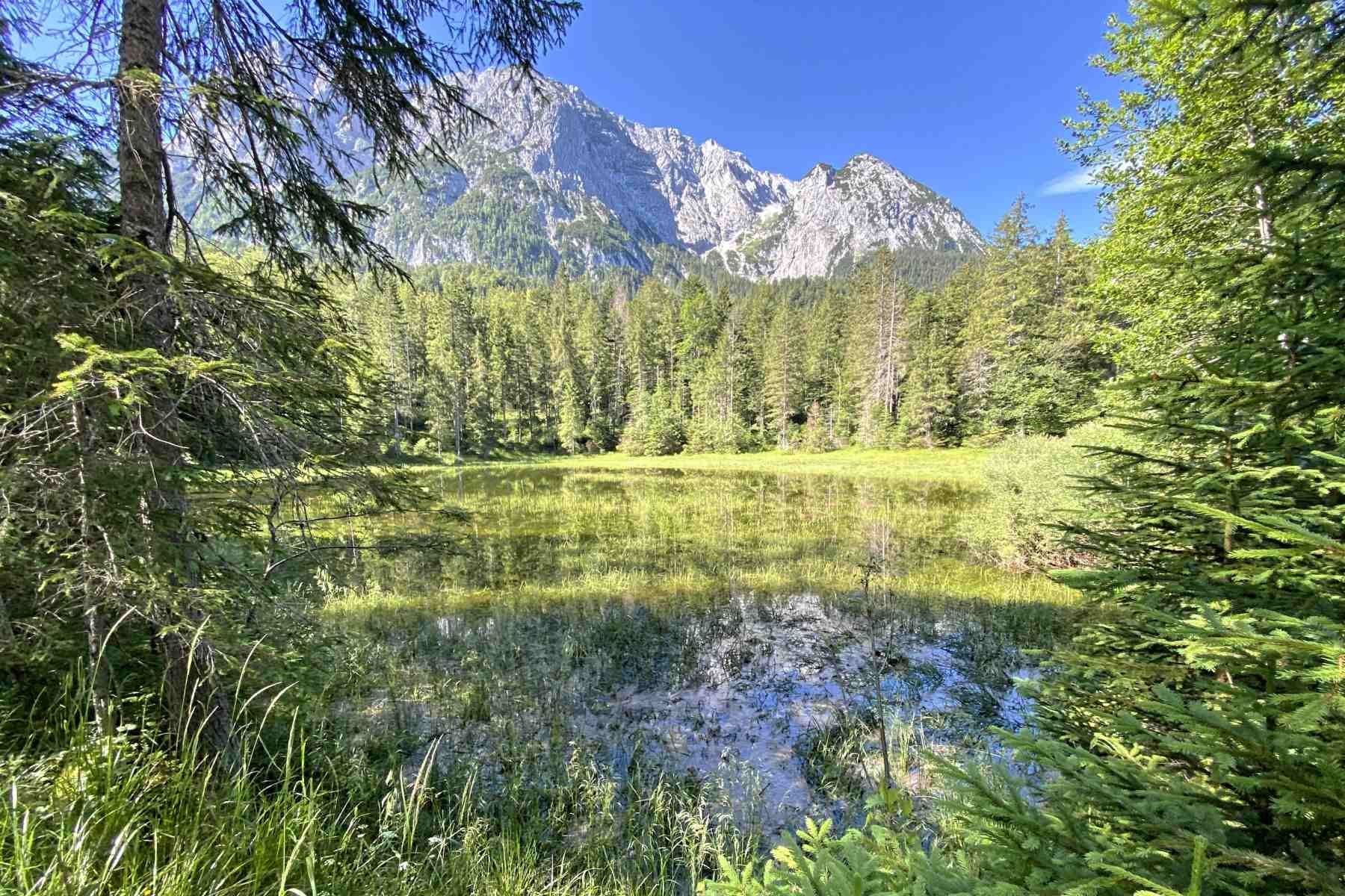 Der Ferchensee liegt auf 1060 m vor der mächtigen Wettersteinwand, die sich wie die Ferchenseewände, im See spiegeln.