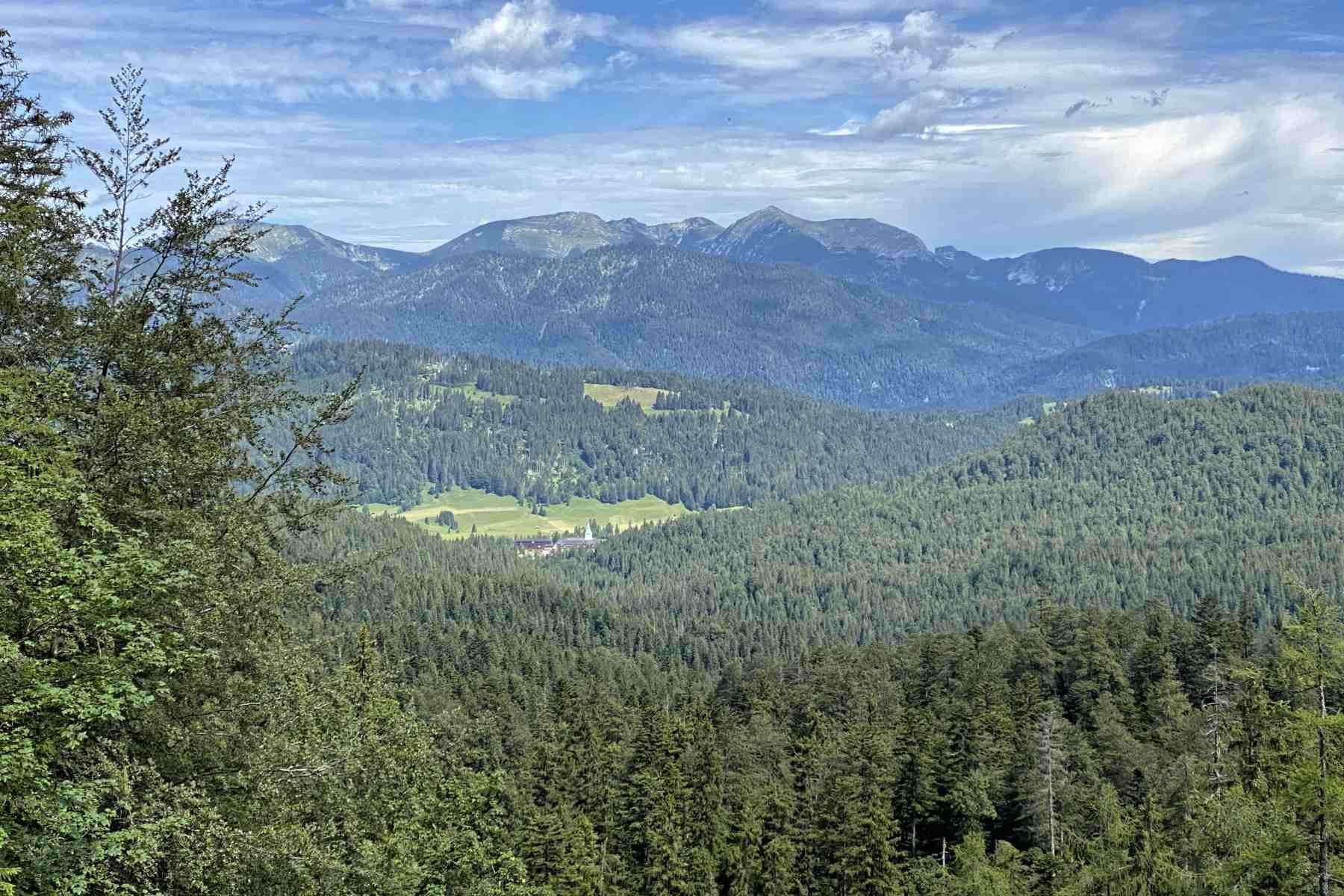 Die gesamte Strecke bis zum Grünkopf und zur Ederkanzel liegen im Bergwald. Hin und wieder gibt es jedoch mal Kahlstellen, wie hier beim Blick zum Estergebirge.
