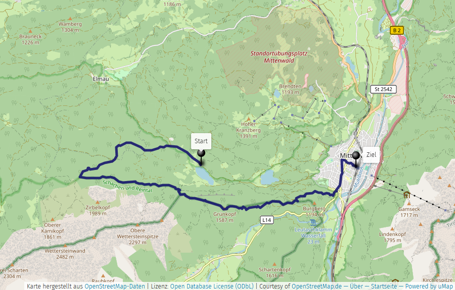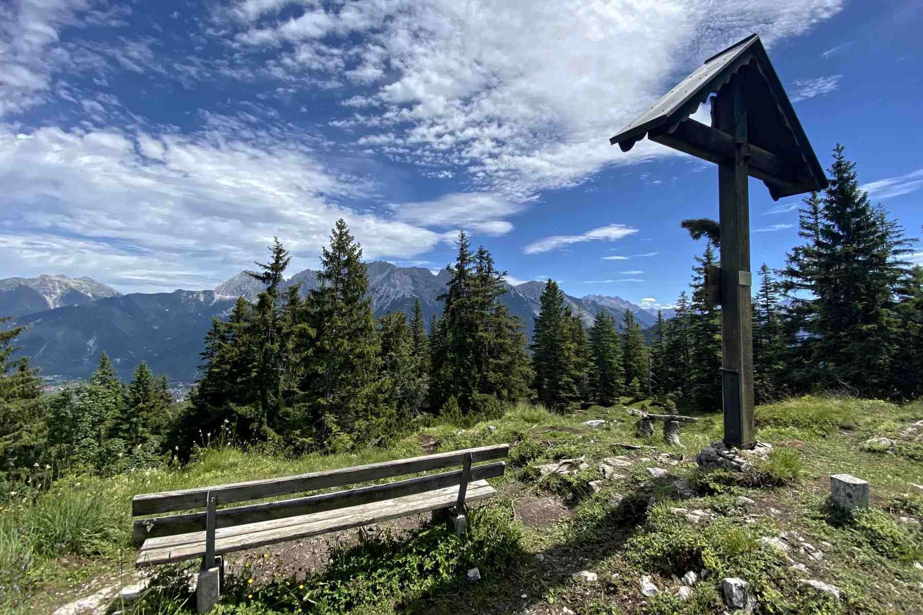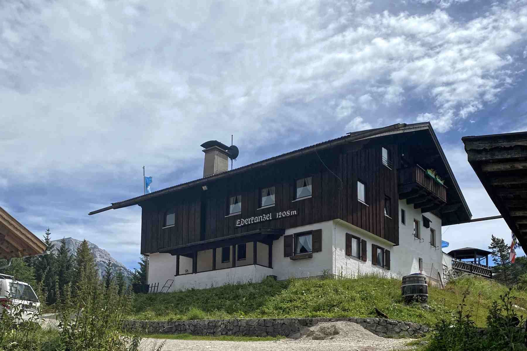 Bei gutem Wetter kann man auf der Terrasse bei einer Brotzeit den Blick auf das Karwendel und in das Leutaschtal genießen, bevor man den letzten Abschnitt in Richtung Mittenwald antritt.