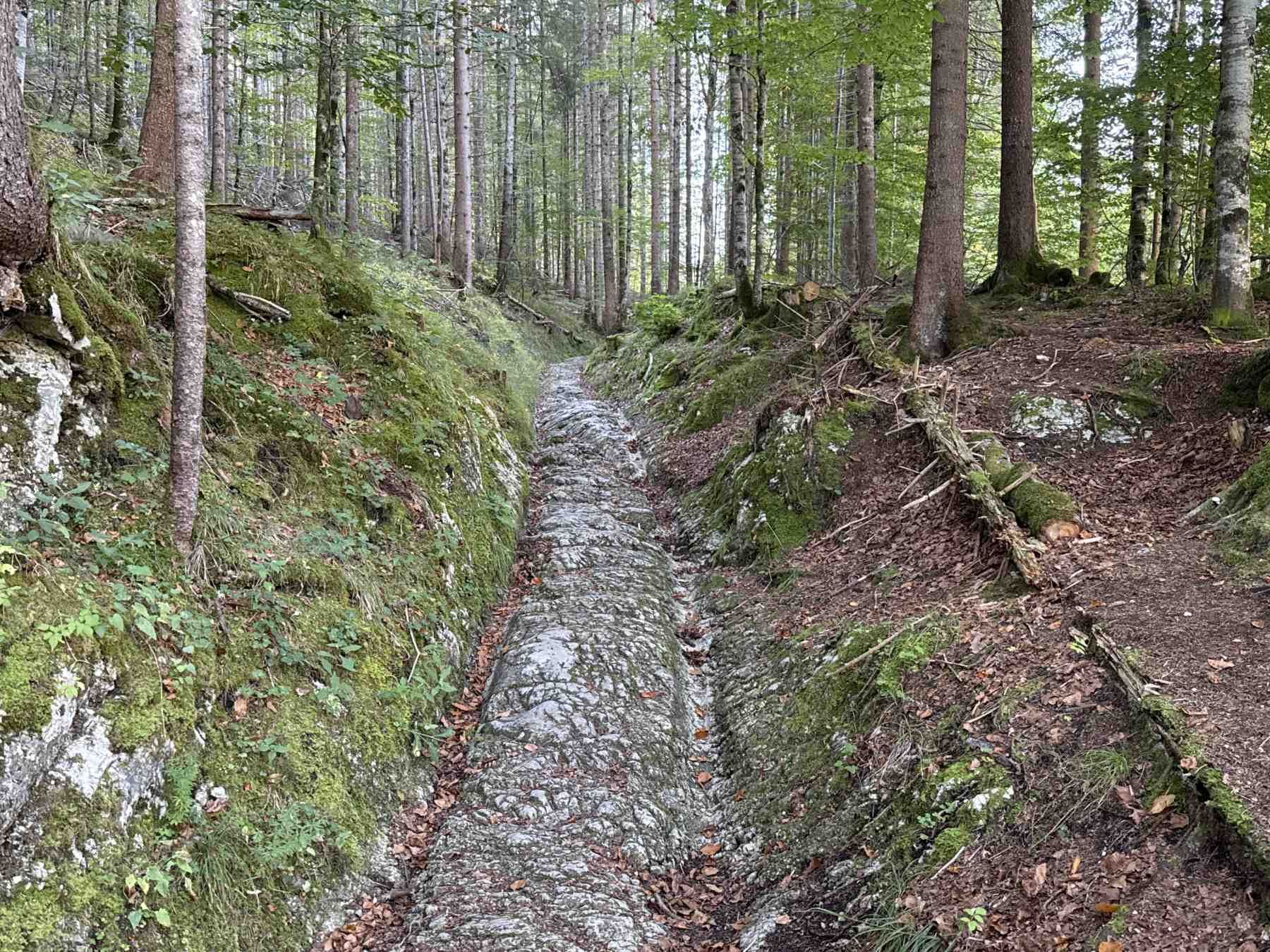 Wir erreichen ein Teilstück des historischen Römerweges, der im Zeitraum 195 bis 215 n. Chr. errichtet worden ist und eine wichtige Handelsstraße zwischen Trient und Augsburg war. Deutlich lässt sich die römische Spurbreite von 107 cm erkennen. Wer mit dem Kinderwagen unterwegs ist folgt lieber noch ein Stück dem Elmauer Weg bis kurz nach dem Ortsende und biegt dann nach links in den ausgeschilderten Wirtschaftsweg ab.