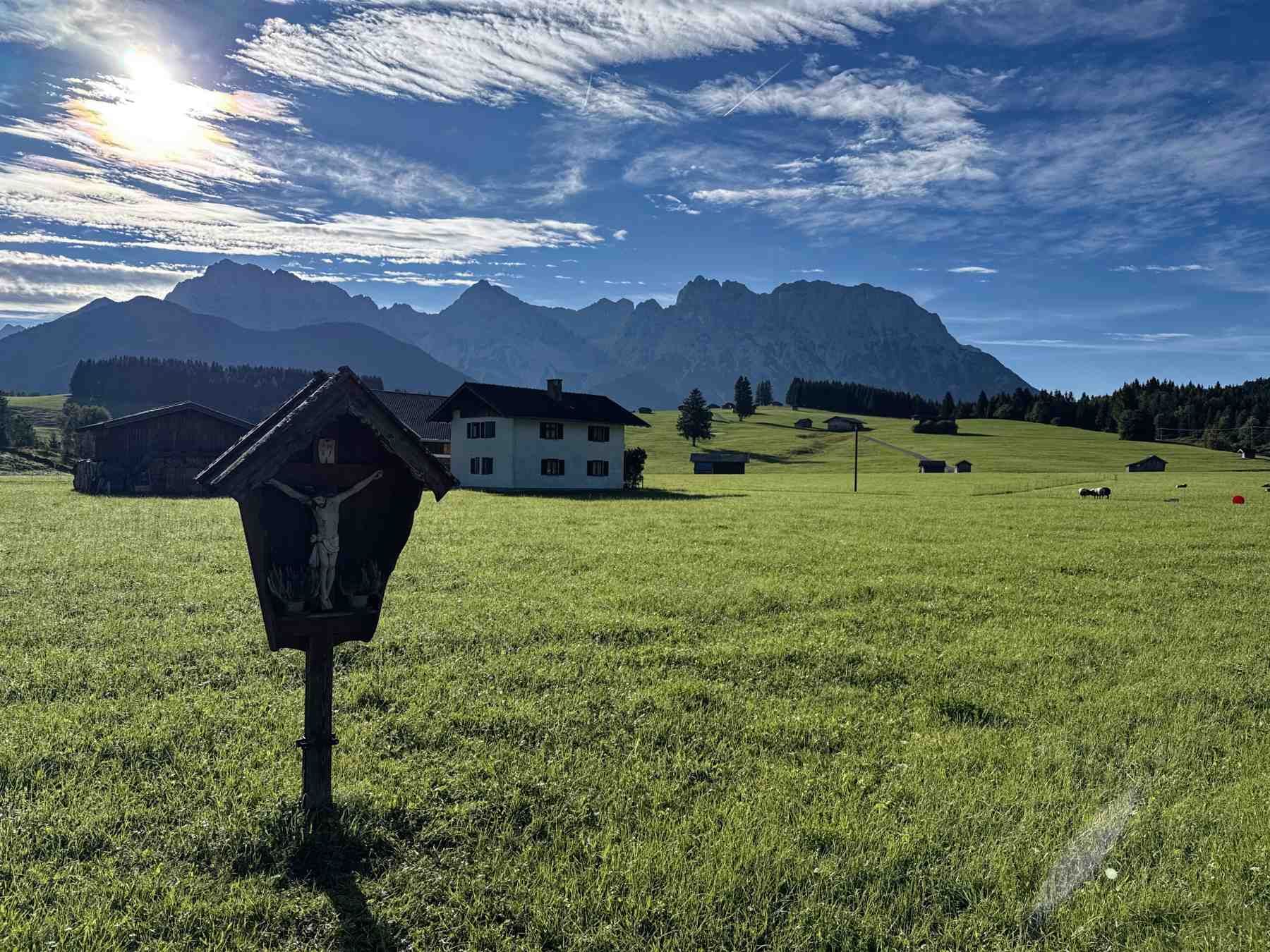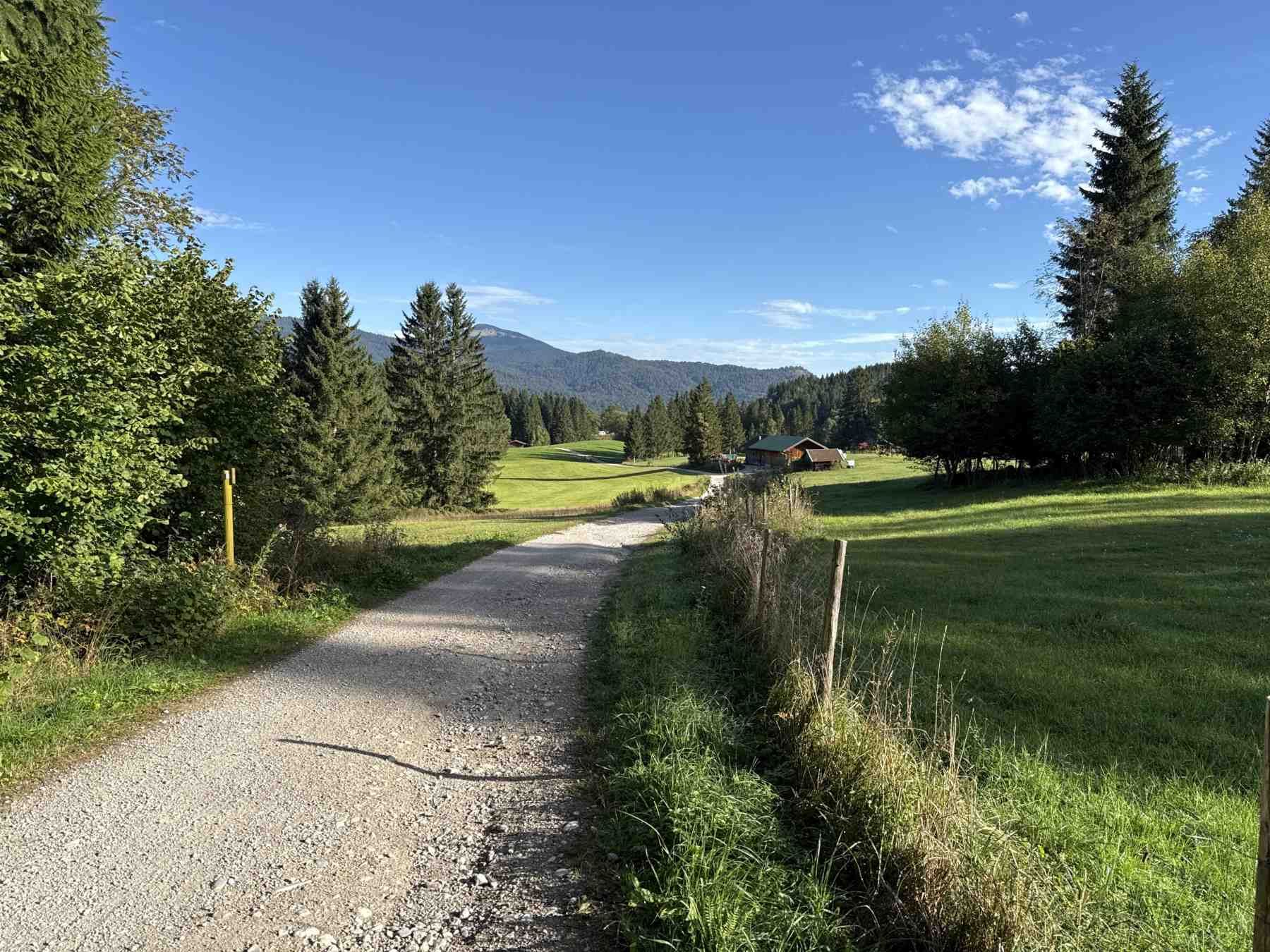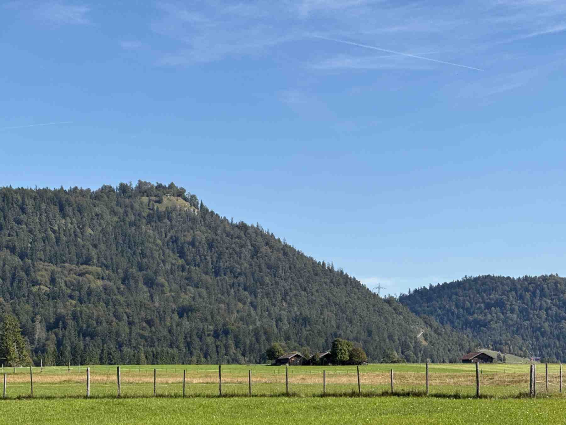 Am Ende des Römerweges gehen wir links durch Wiesen in Richtung der Siedlung "Am Quicken". Wir sehen dabei Ausläufer der typischen "Buckelwiesen" Formationen. Nach dem Überqueren dee Bahngleise gehen wir links in Richtung Tennsee. Besonders schön ist auf diesem Wegabschnitt die traumhaften Ausblicke auf das Karwendel.